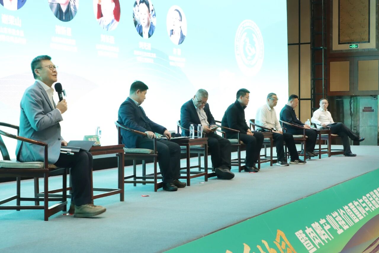 在“水禽产业高质量发展论坛”环节,信得科技董事长李朝阳与益客集团副总裁王维、山东丰盈食品总经理谢荣山、和康源集团执行总裁褚新星、山东昌盛禽业董事长刘长胜、新泰市天信农牧董事长刘光洲、禽高创总经理许毅,围绕“肉鸭行业产能调控”、“种商协同机制”、“消费场景拓展”等议题展开深入研讨。与会嘉宾结合各自企业实践与行业洞察,剖析了当前肉鸭产业面临的难题,并提出应对思路。大家一致认为,肉鸭行业同仁应深化协同,理性调控产能,积极拓展终端消费场景,并通过推动种商一体化,为商品代养殖筑牢健康防线。